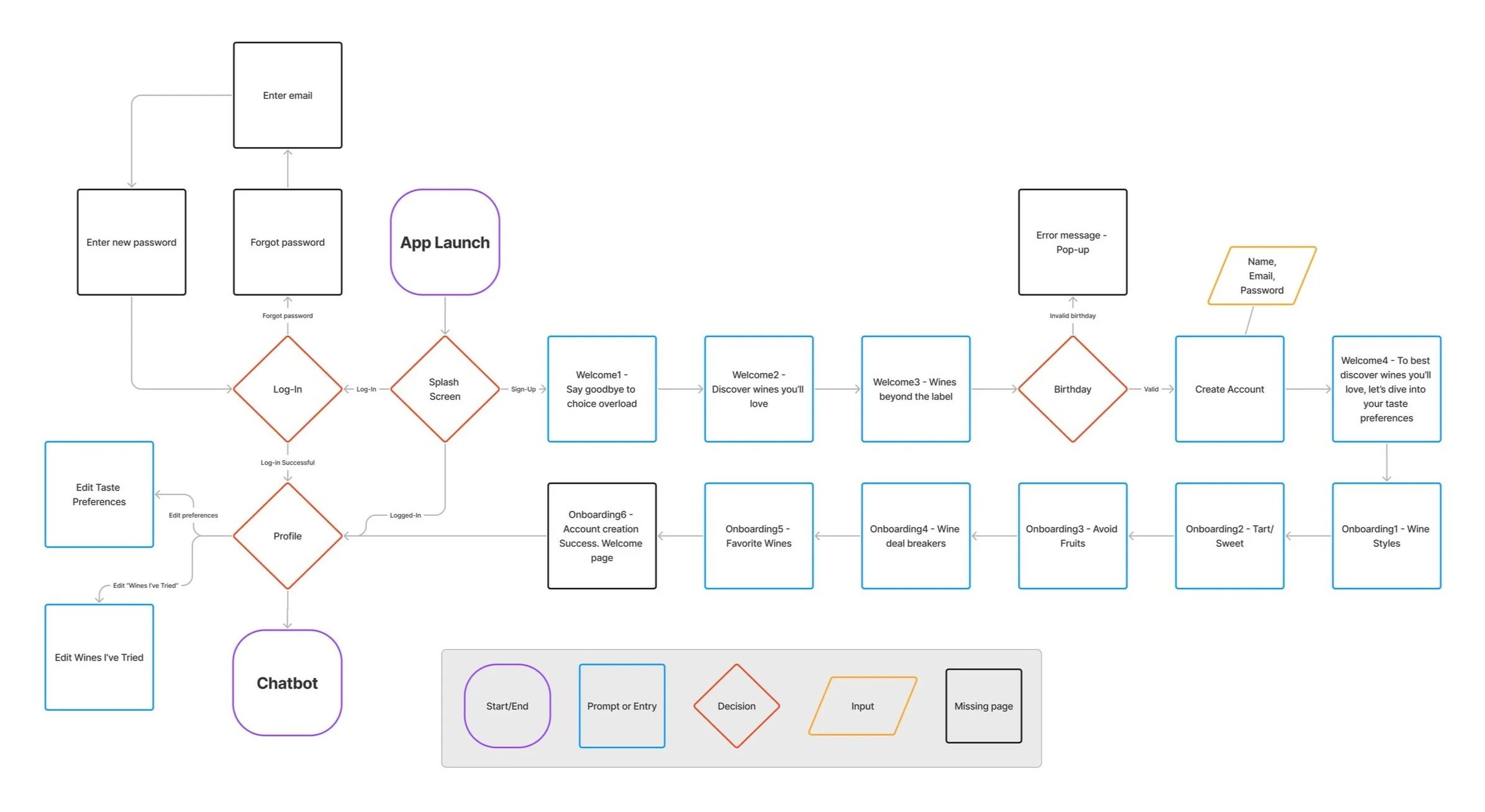 Once the client approved the high fidelity prototype, the team conducted moderated usability tests with participants who had varying degrees of wine knowledge. We collaborated to create a script for testing the onboarding & chatbot user flows. We also tested two edge cases where we asked the users to edit their flavor preferences & interact with the “Wines I’ve Tried” section in the user profile. We tested the app with 4 participants & recorded the sessions for our notes.