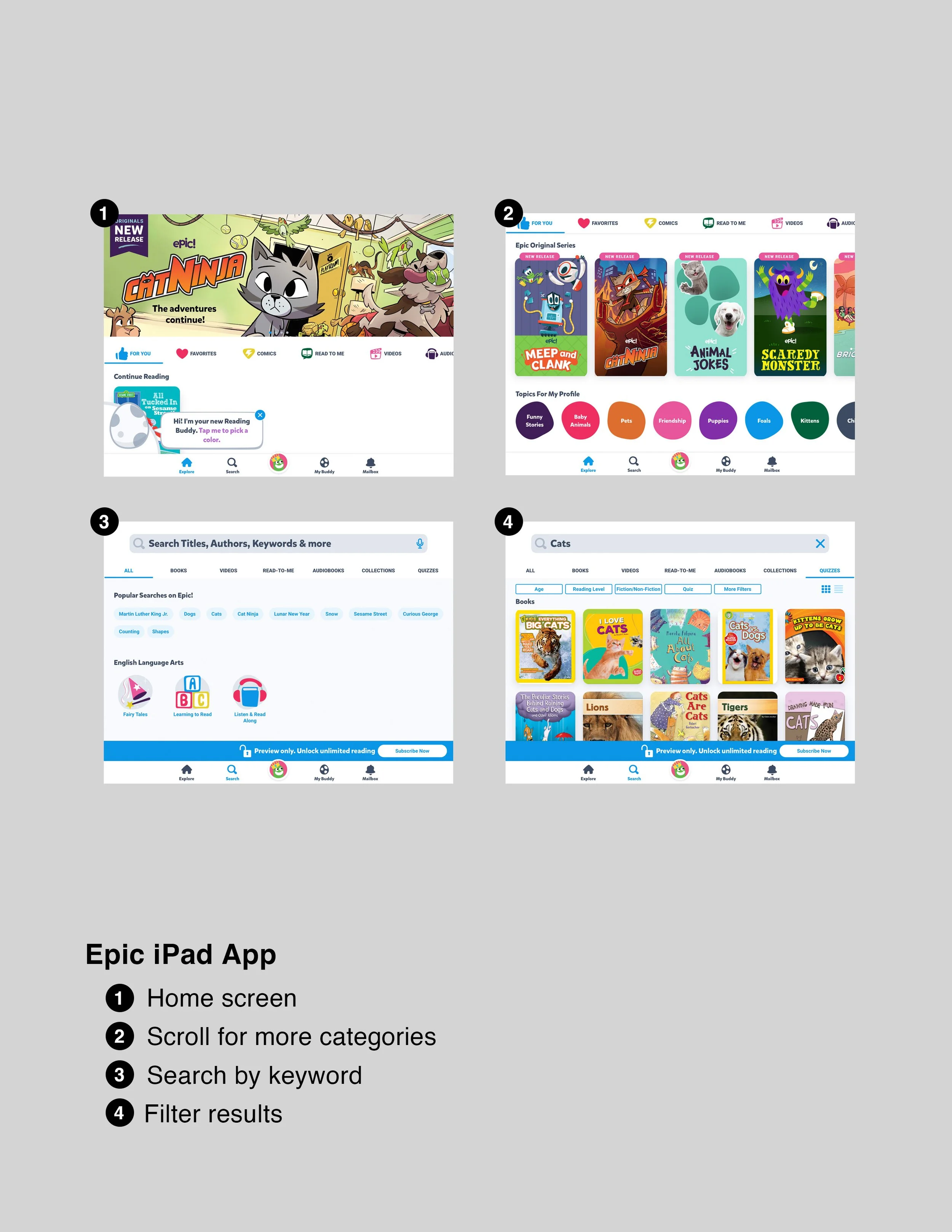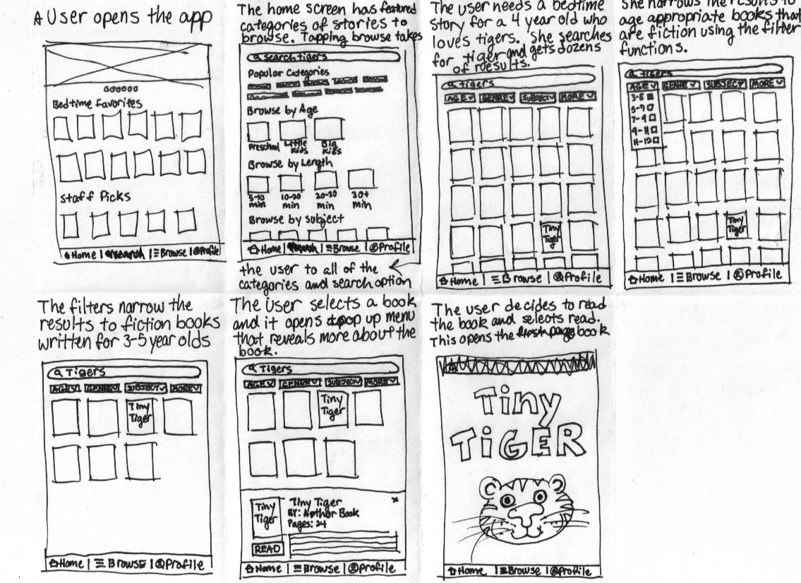I combined elements from my Crazy 8s exercise to design a search screen with books organized by categories & filters for narrowing down search results. I then created a storyboard for the steps a user would take when searching for a book about tigers for a 4-year-old.