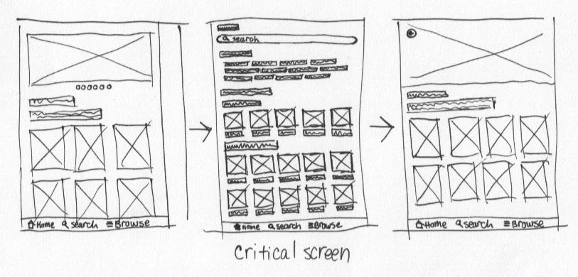 On day 2, I used my competitor analysis document & user research as guides for my ideation sketches. I employed the Crazy 8s method to come up with many solutions for the critical screen, the search screen, in a short amount of time. I also organized a user flow that would make it quicker to find specific content.