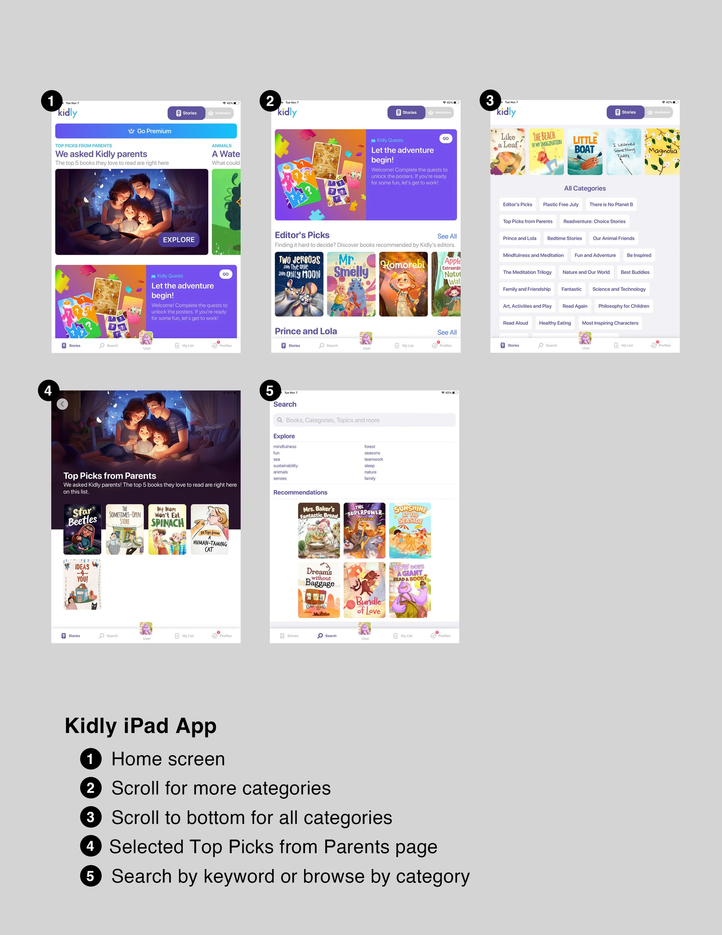 Since parents reported difficulties in quickly finding specific content in the TinyTales app, I focused my research on how each app handled categorizing, organizing, & presenting available content. I studied the home screen & search screens of each app.